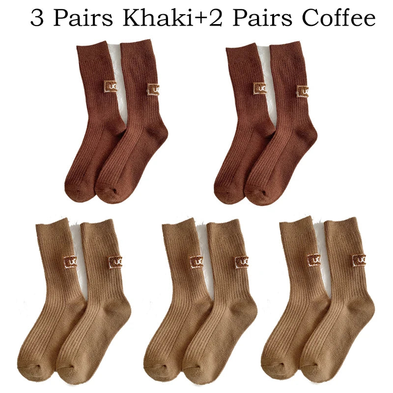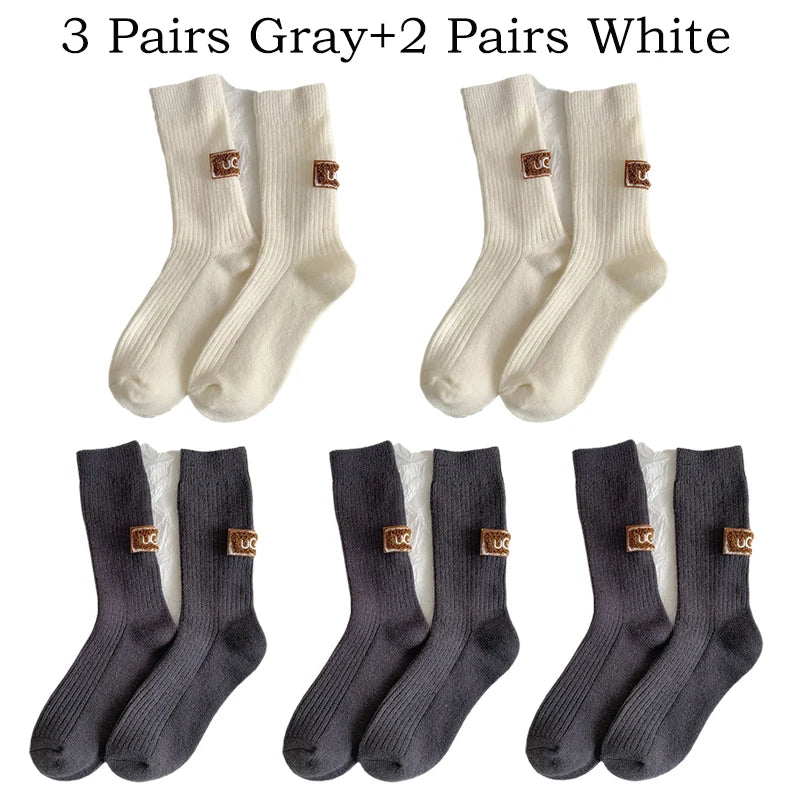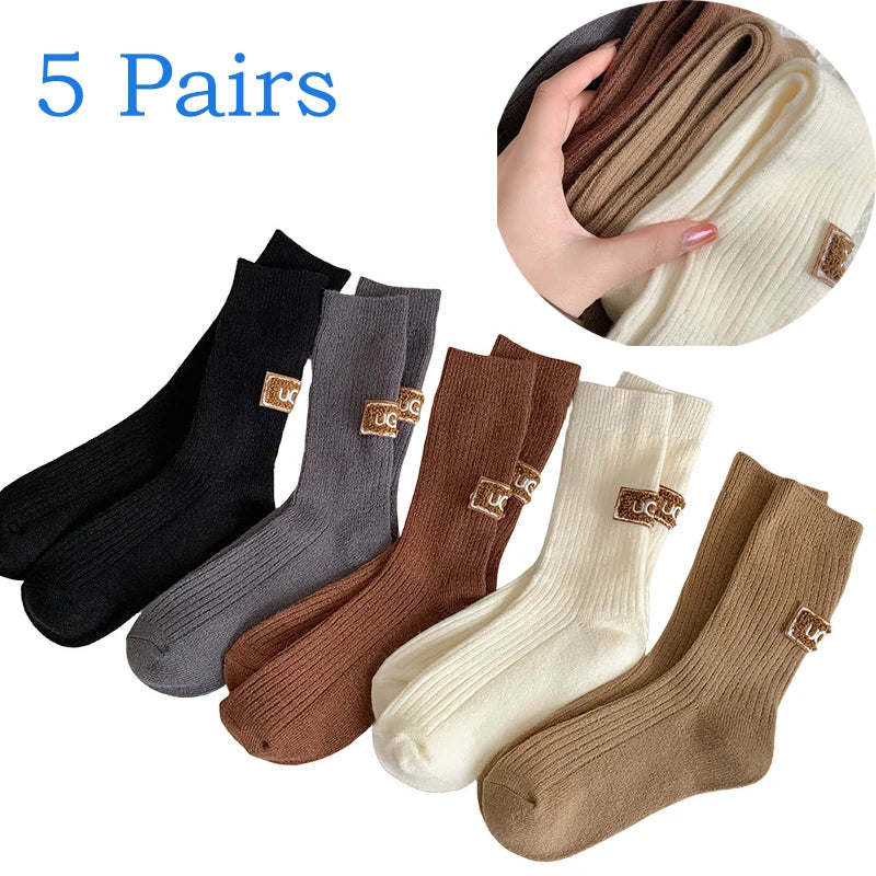 Lot de 5 paires de chaussettes d'hiver pour femme, en laine cachemire, chaudes et épaisses, avec logo brodé, mi-mollet, style décontracté, parfaites pour les bottes de neige.