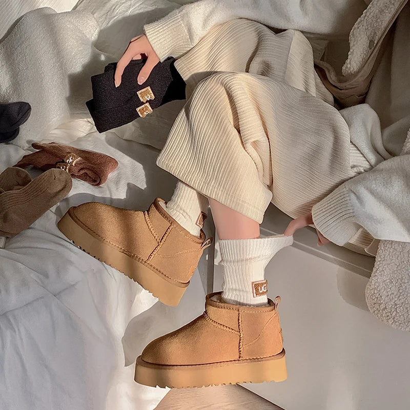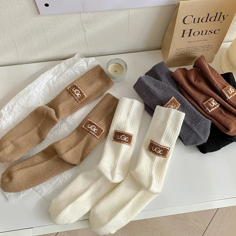Lot de 5 paires de chaussettes de luxe pour femme, en cachemire et laine, chaudes et épaisses, avec logo brodé, mi-mollet, style bottes de neige décontractées.