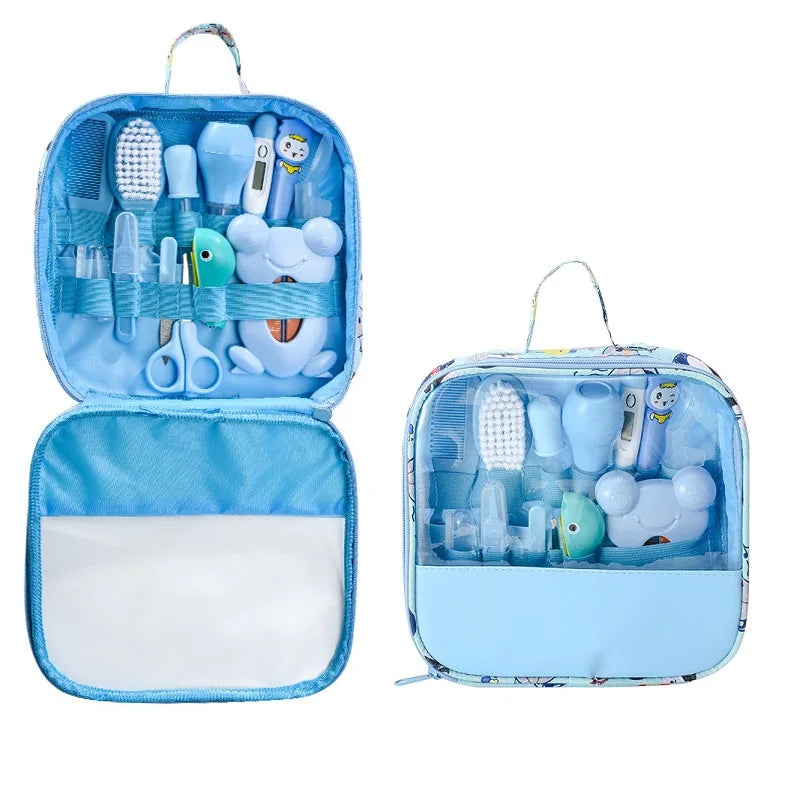 Baby Grooming Kit: The package comes with the baby grooming kit, including baby nail file, Newborn hair brush, Babies comb, finger toothbrush, tweezer, nasal aspirator, baby scissors, medicine dropper, portable blue EVA bag, and measuring spoons(ml).This grooming kit can be used for our newborn baby's daily needs.