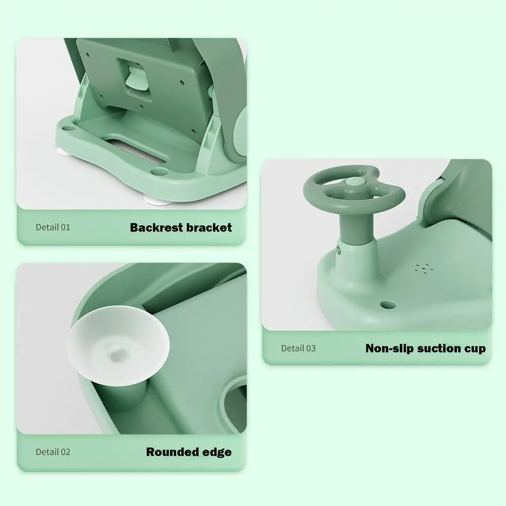 4.Exciting Imagination: Add excitement to bath time with our car-shaped baby shower seat. The detachable steering wheel design increases seat stability and stimulates your baby's imagination for a more engaging experience in the tub.