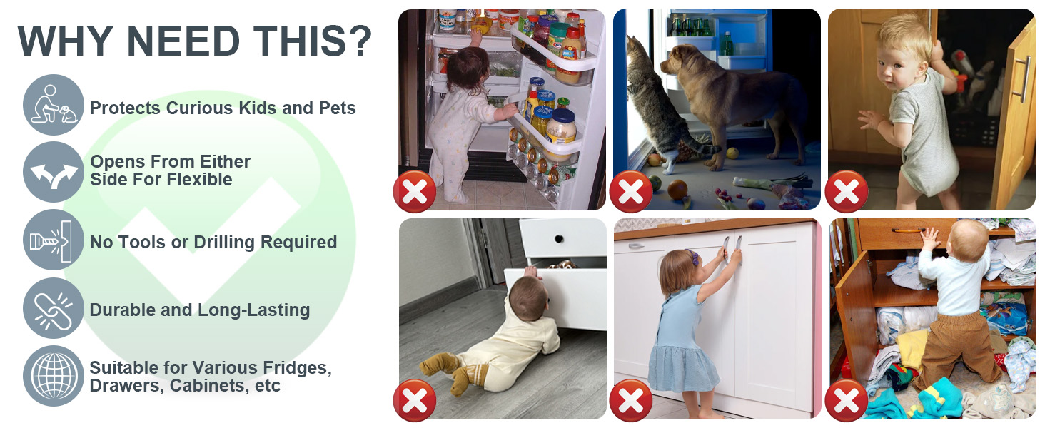 Multi-Purpose Protection: Essential baby proofing for curious explorers! Effectively prevents children from accessing fridges (eating spoiled food or getting trapped) and secures cabinets/drawers. Stops pets from tampering with doors or damaging food. Protects Kids, Pets & Food – the ideal childproof cabinet locks solution