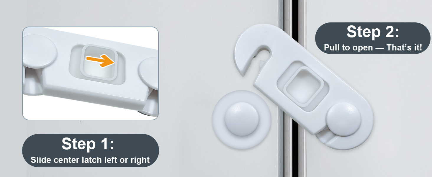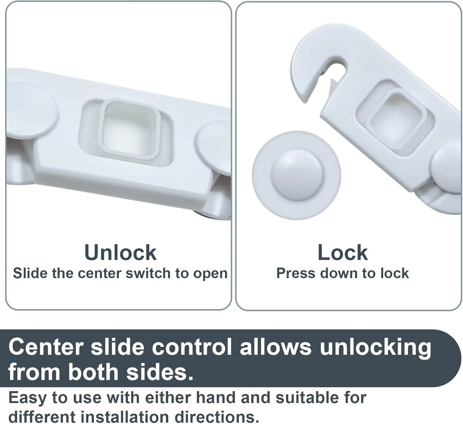 Dual-Sided, Direction-Free Design: Opens effortlessly from either end! This intuitive child safety cabinet lock features a symmetrical design, making installation direction-free and operation smooth for adults – no matter your dominant hand. Flexible design ensures there's no "wrong" way to install