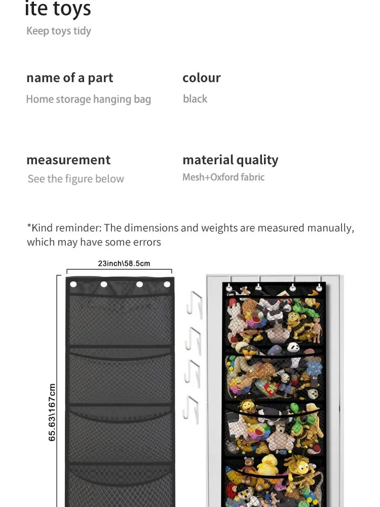 • Space-saving design :The hanging toy storage bag is designed to save space by hanging over a door or other surface, making it perfect for small rooms or apartments.