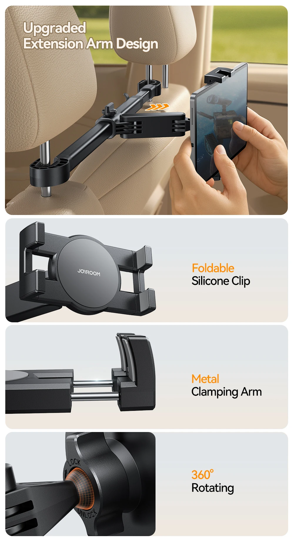 【STABLE & DURABLE】 Joyroom tablet holder for car is made of high-strength material, the telescopic rod is made of aluminium, and the clamp is made of ABS material, the soft rubber lining protects your devices from friction, the telescoping arms can effectively prevent vibration while firmly grasping your rear seat and devices.