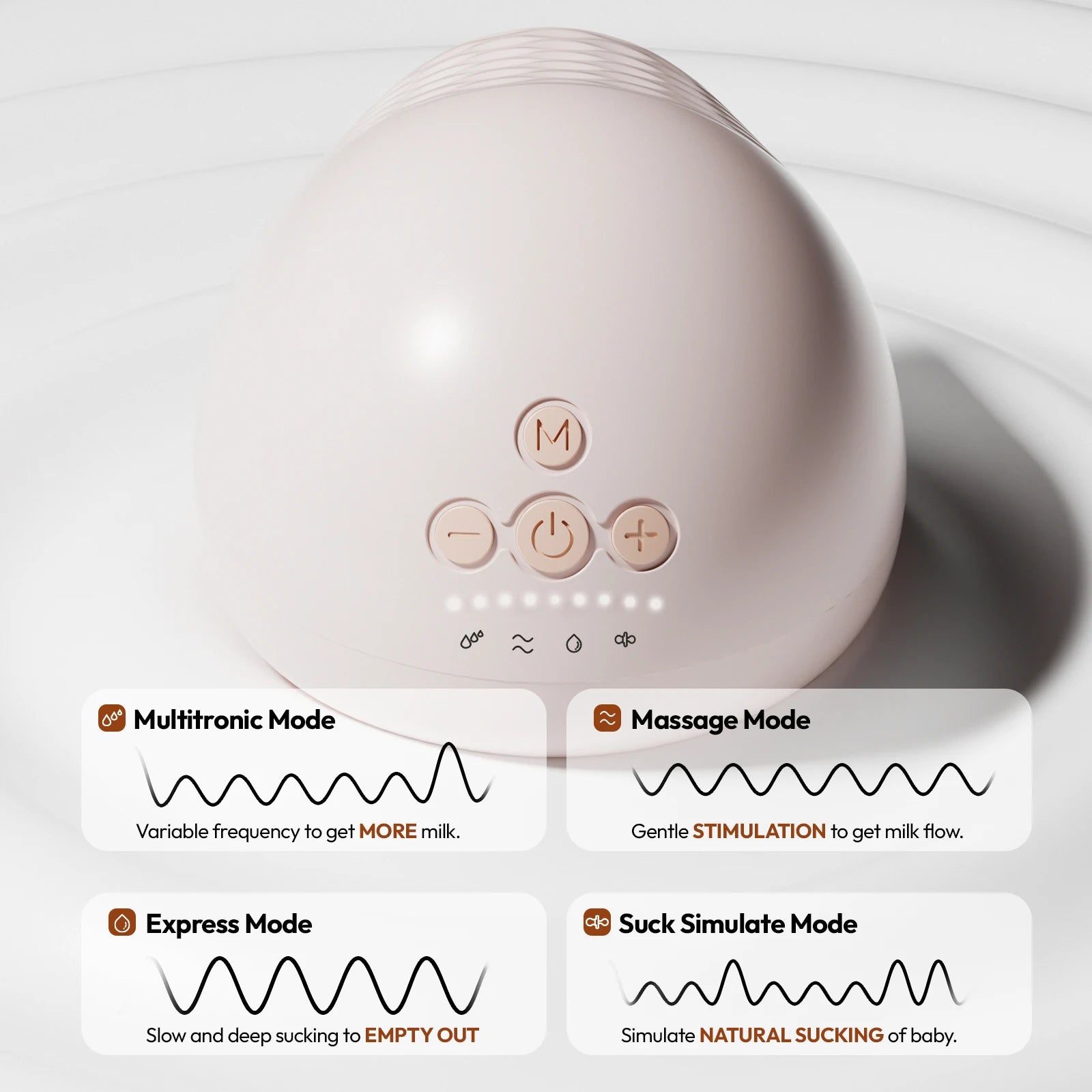 8113 has 4 modes and 9 levels. It adopts multi-mode frequency conversion toVariable frequency to get MORE milk, and the massage mode gently stimulates the flow of milk, simulating the natural sucking of infants.