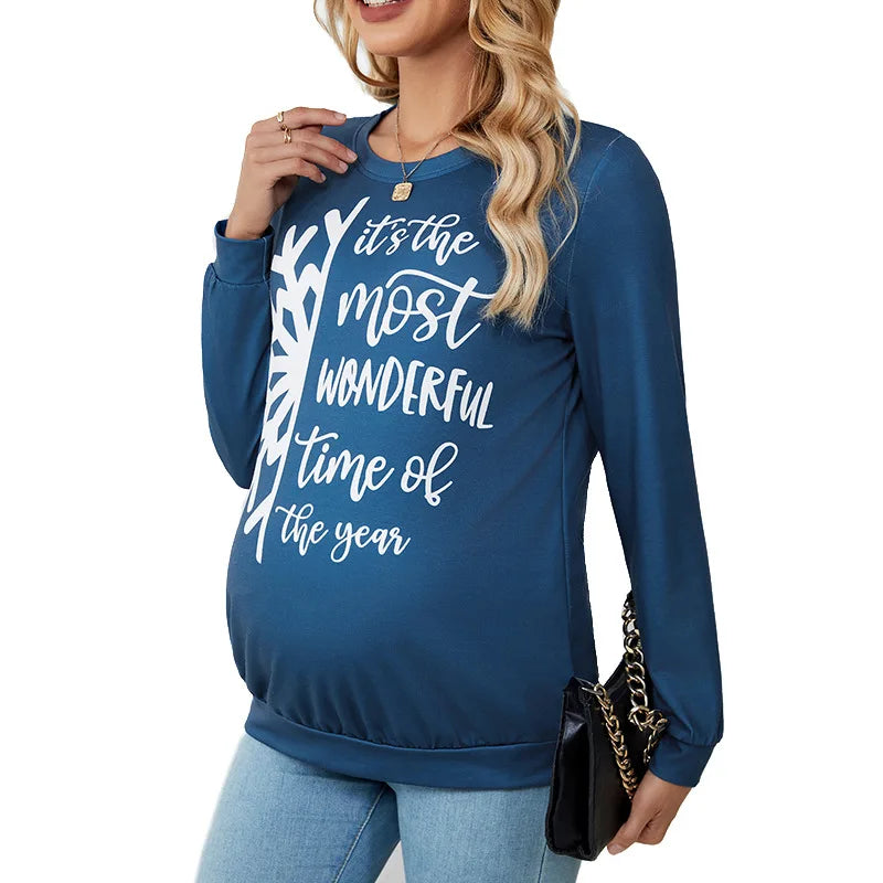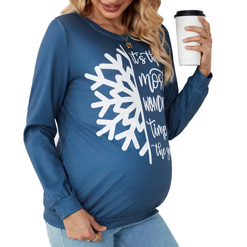 Plus Size Casual Women Pregnant Hoodies Blue Crew Collar Print Hoodied Comfortbale Tops