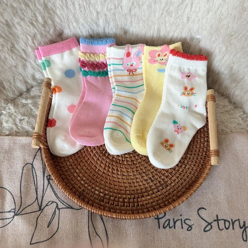 5 Pairs Cute Cartoon Kids Girls Socks Soft Breathable Mid-Calf Socks with Polka Dot Striped Animal Pattern Toddler Socks F7033