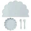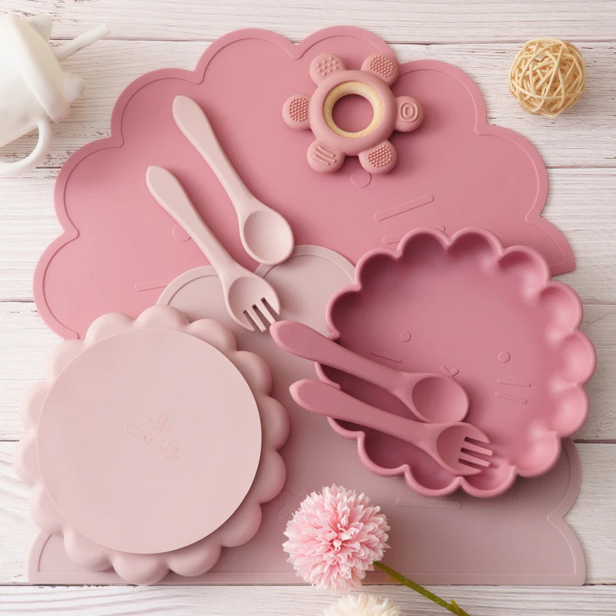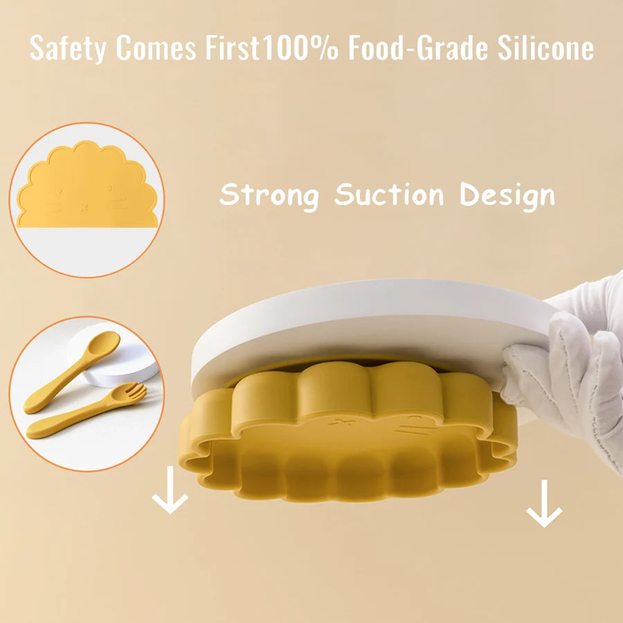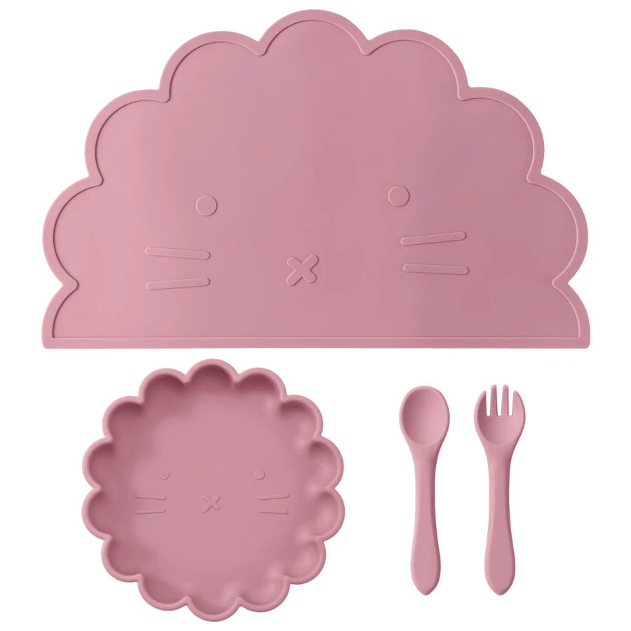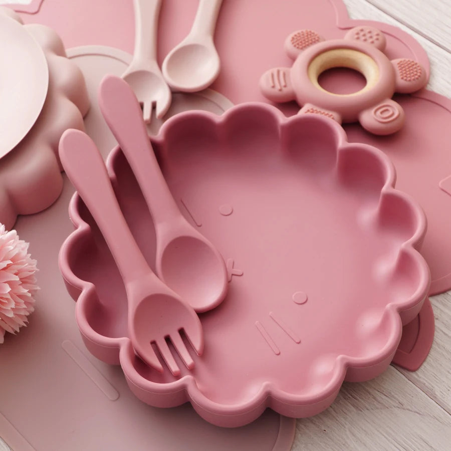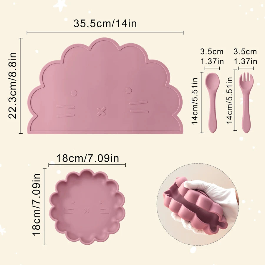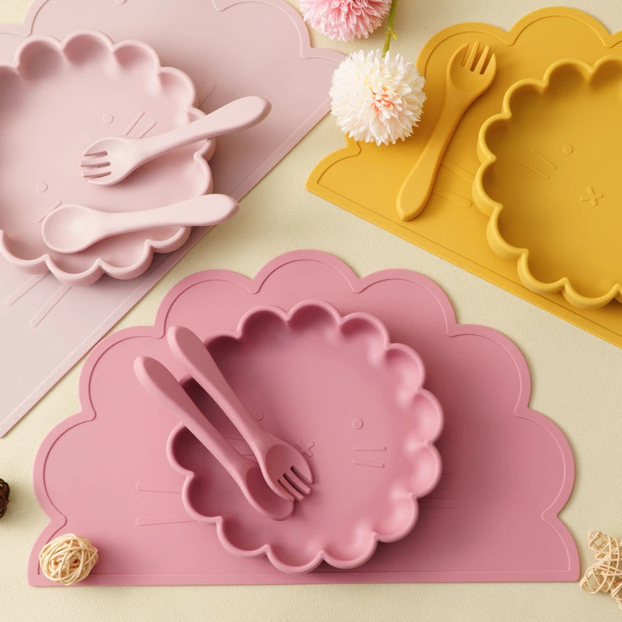 Wholesale BPA Free Silicone Baby Feeding Set 4 Pcs Cartoon Shapes Place Mat Soft Spoon Fork For Kids Newborn Weaning Tableware